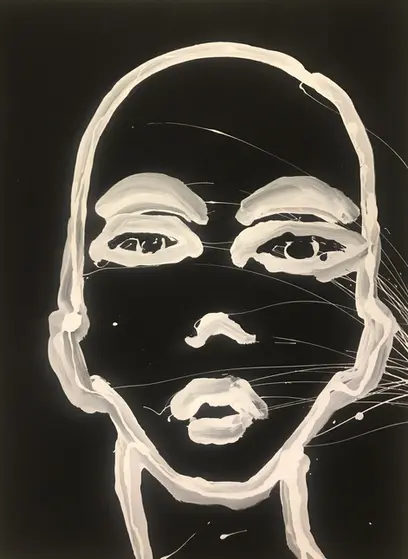 The deep matte black background swallows the incisive and quick brush strokes and capture the fleeting evanescence of the enigmatic persona. The incisive intensity of the gaze and the traces of the brush strokes weave an enigmatic connection with the viewer.