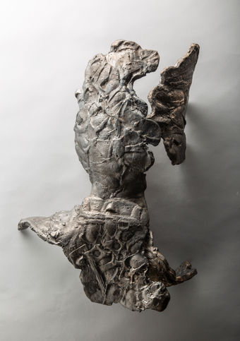 The scattered fragments of ceramic and bronze sculptures shaped from the human torso and discarded objects acknowledge destruction and material permanence. These textured objects were constructed out of egg cartons , contorted and shaped through traditional casting processes